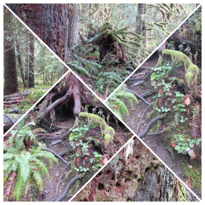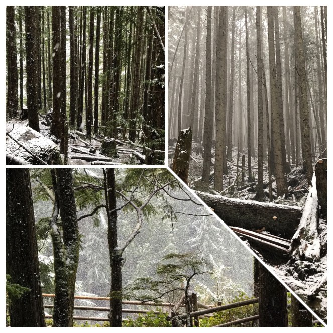 The trail began clear, slightly wet ground but easy going. Some trees in the growth had come down in recent high winds, but the path was clear. I like this route because you see trail runners, dogs and families along it. As we got higher the rain began, until we got higher above some of the lower tree line, and the rain turned into snow. The snow began to settle the further up we got and it was beautiful. We didn’t need spikes or anything but I do think if the weather up there gets any colder I’m sure the ground will freeze.